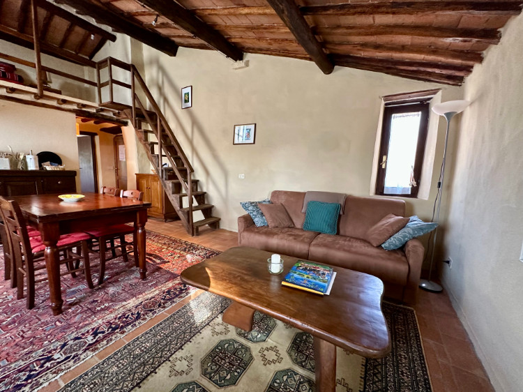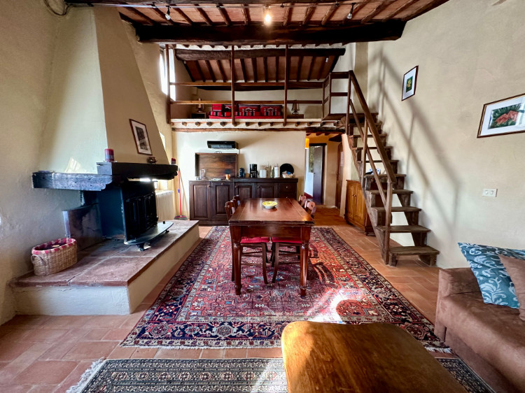 Schlafzimmer mit Doppelbett, Wohnzimmer mit Kamin und Galerie, offene, kleine Küche (Kitchenette), Bad, Terrasse/Sitzplatz (gemeinsam mit Tartuca).